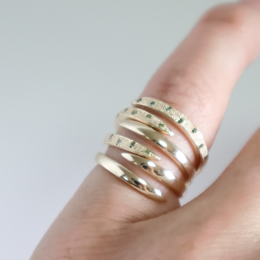 また、2本3本と重ねづけするとトグロを巻いた蛇に見えるリングなのです。