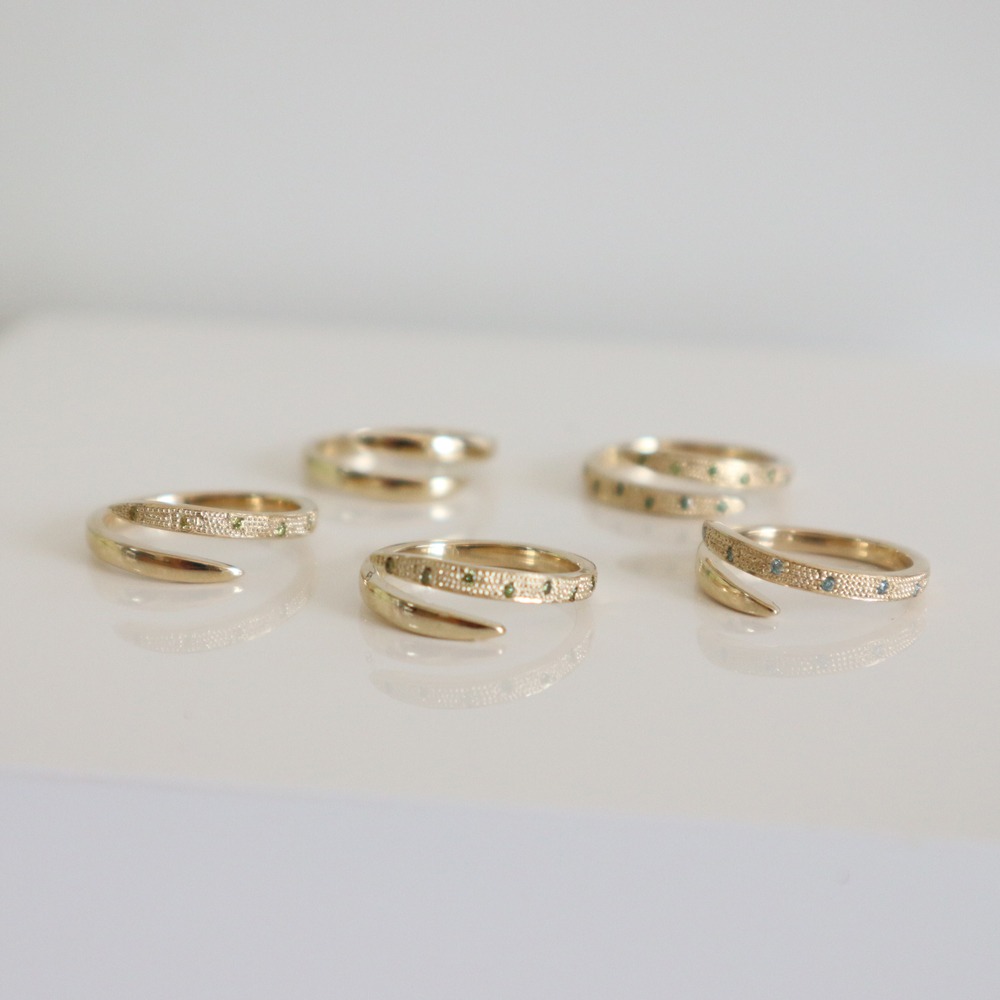 こちらのピンキーリングも鏡面仕上げのプレーンバージョンから、リングの片腕のみダイヤを蛇の鱗のように石留め、そしてリングの両腕にダイヤモンドが入るバージョンと進化していきます。 グリーン、ブルー、イエローといったカラーダイヤモンドを散りばめました。